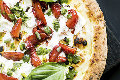 Pizza mit Oliven, Pesto & Tomaten (vgn)